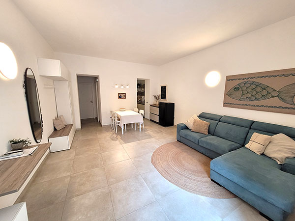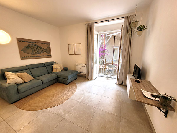 Im gemütlichen Wohnzimmer befindet sich ein Essbereich für vier Personen, ein Schlafsofa für ein evtl. mitreisendes Kind, ein Fernseher und ebenfalls eine Klimaanlage. Vor dem Wohnzimmer befindet sich ein französischer Balkon.